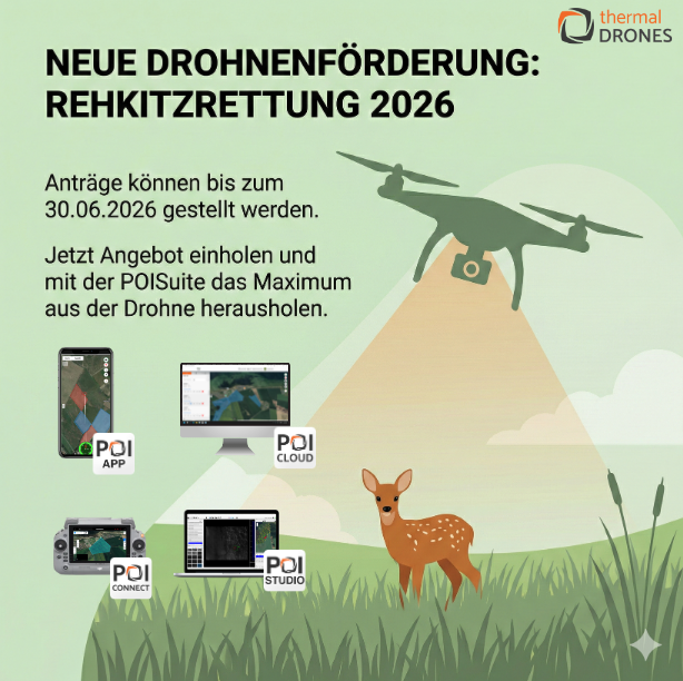 Das BMLEH hat auch für 2026 eine Förderung für Drohnen zur Rehkitzrettung mit einem Festbetrag von 3000€ zugesichert.
