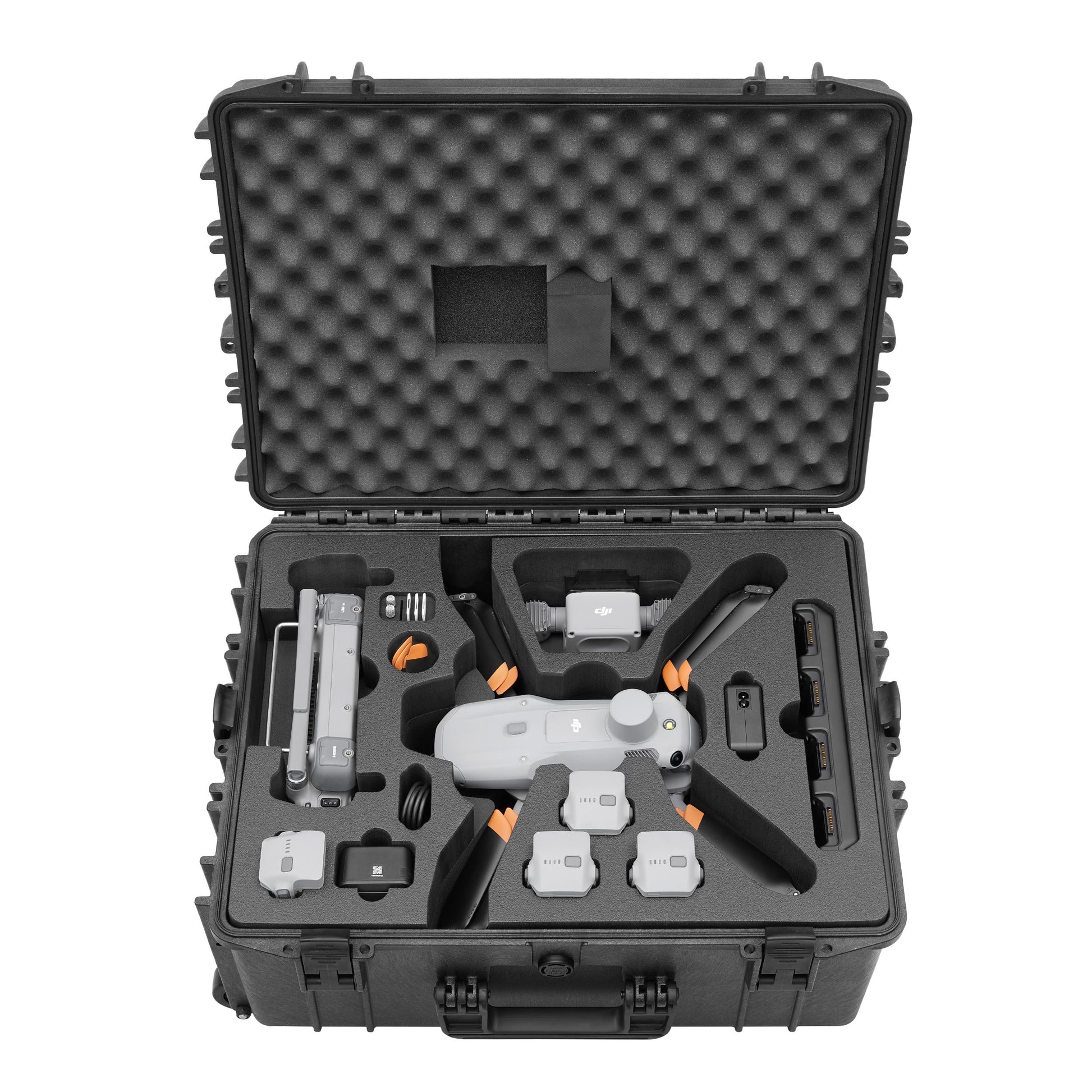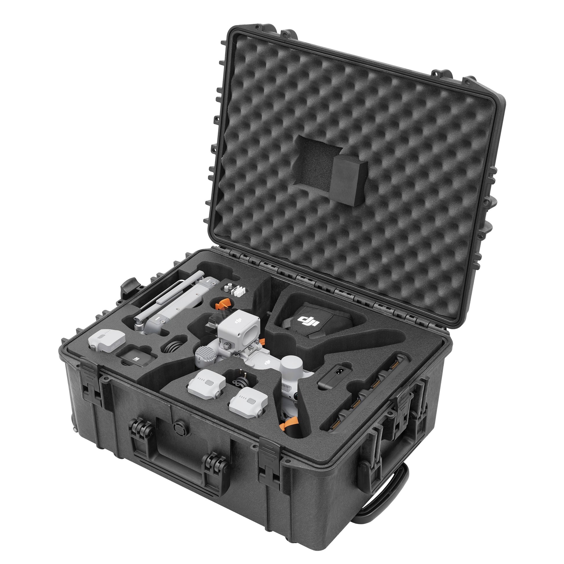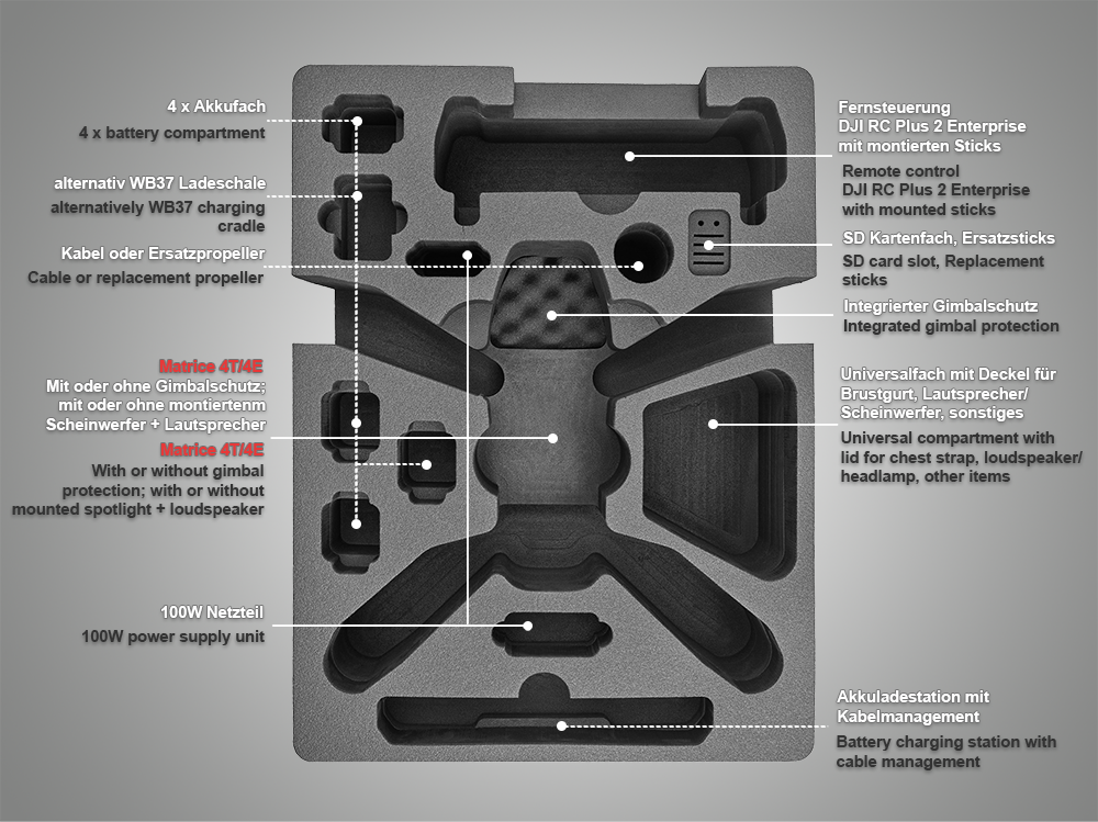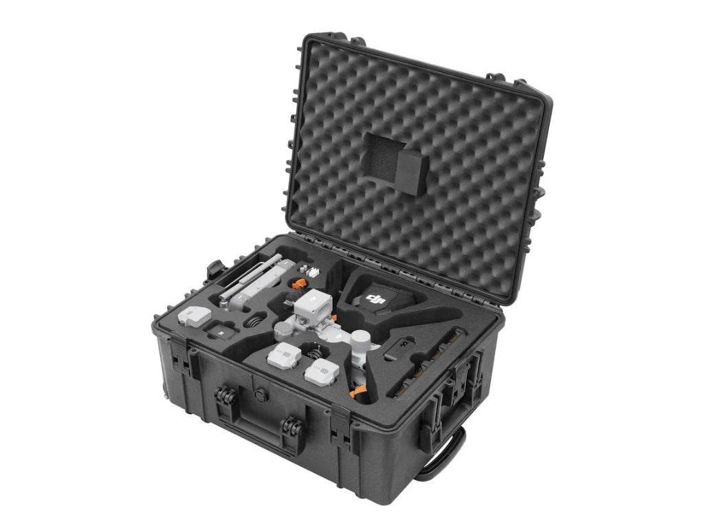 Dies ist ein hochwertiger Outdoor Transportkoffer von TOMCase speziell für Matrice 4 Drohnen. Das Inlay besteht aus robustem PE-Hartschaumstoff und nimmt eine Matrice 4 Drohne mit ausgeklappten Flugarmen und montierten Propellern, sowie die Fernsteuerung sicher und flugbereit auf. Des weiteren kann noch Zubehör wie Akkus und Ladegerät verstaut werden. Scheinwerfer und Lautsprecher können verbaut oder unverbaut mit aufgenommen werden.